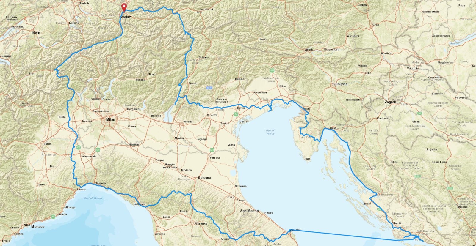 Hatte jetzt nochmlas 2 Wochen Urlaub. Fuhr jetzt ungefähr die Tour, die ich im Juni schon Fahren wollte. Kam dabei aber nicht bis nach Dubrovnik sondern nur bis Split. War ein sensatieneller Trip durch Südeuropa. Motorrad machte keine Probleme, trotz des Tankens von Diesel 🙁 . Auf der Karte kannst du sehen, welchen Weg ich genommen hab.