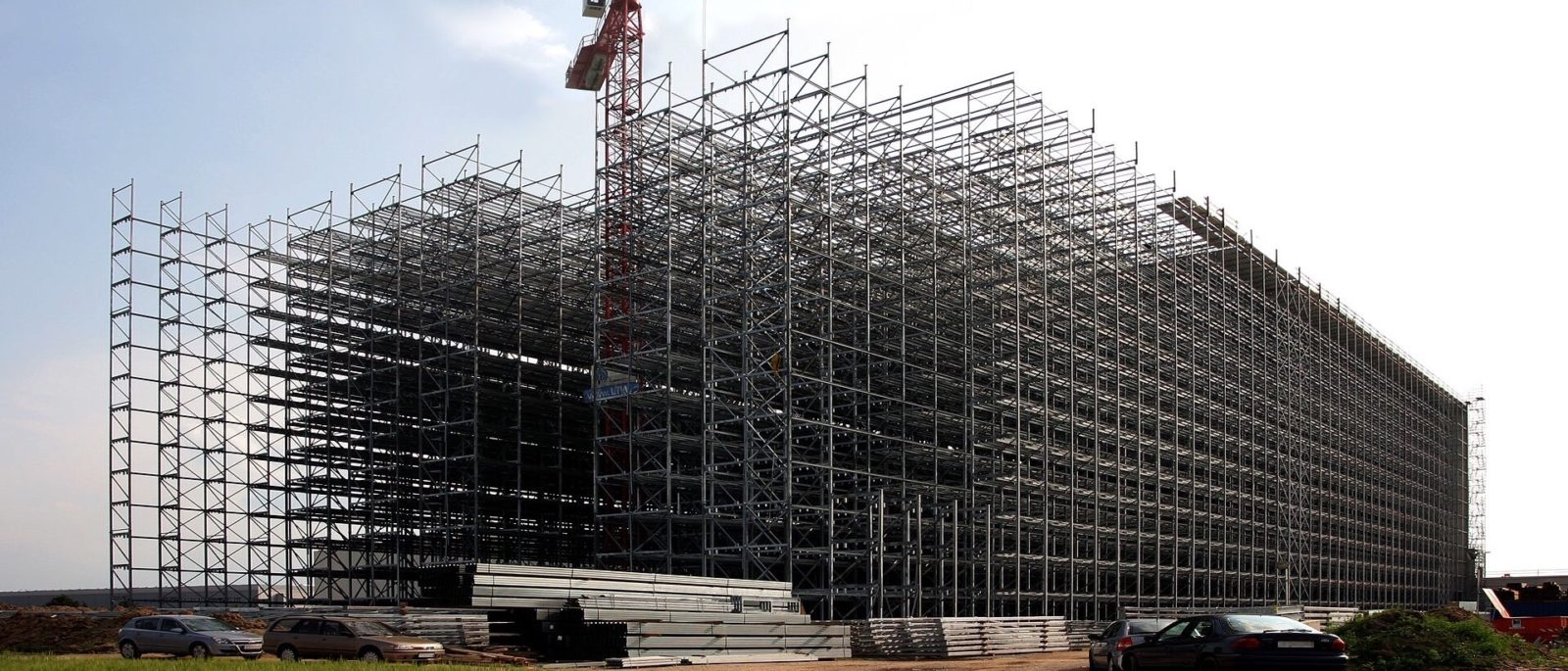 Das Hochregallager im Distributionszentrum Biebesheim am Rhein mit 55.000 Stellplätzen für Europaletten während der Bauphase…. … und danach.